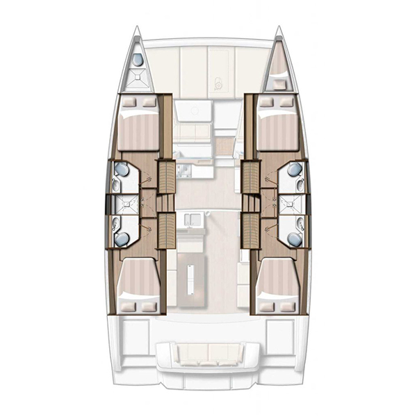 Layout: 4 double cabins with 4 bathrooms and 4 showers